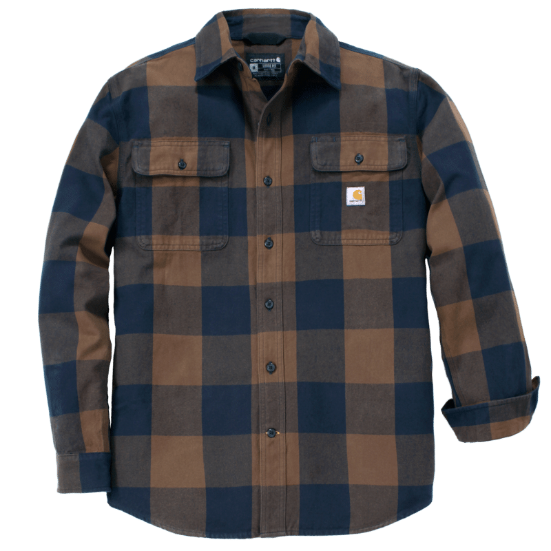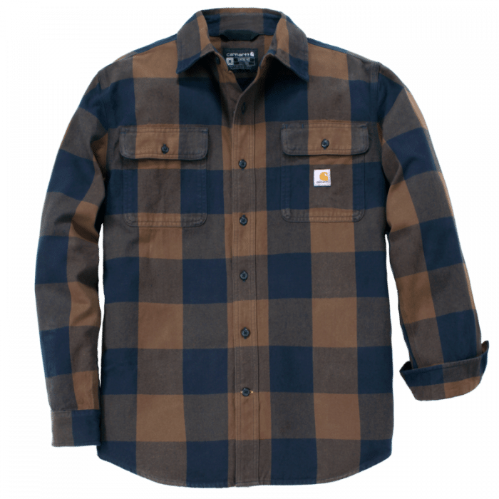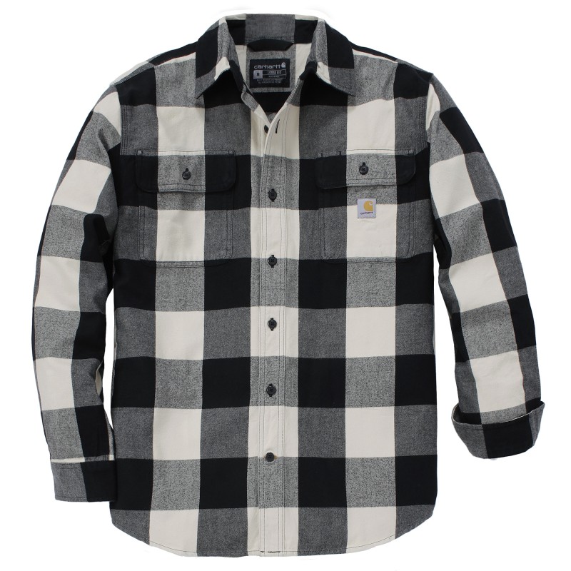 Chemise manches longues en coton flanelle • Col évasé • 2 poches poitrine avec rabat et fermeture par bouton, 1 poche stylo • Fermeture frontale à boutons • Poignets réglables à deux boutons • Coutures principales triples • Étiquette Carhartt® cousue sur la poche avant gauche.