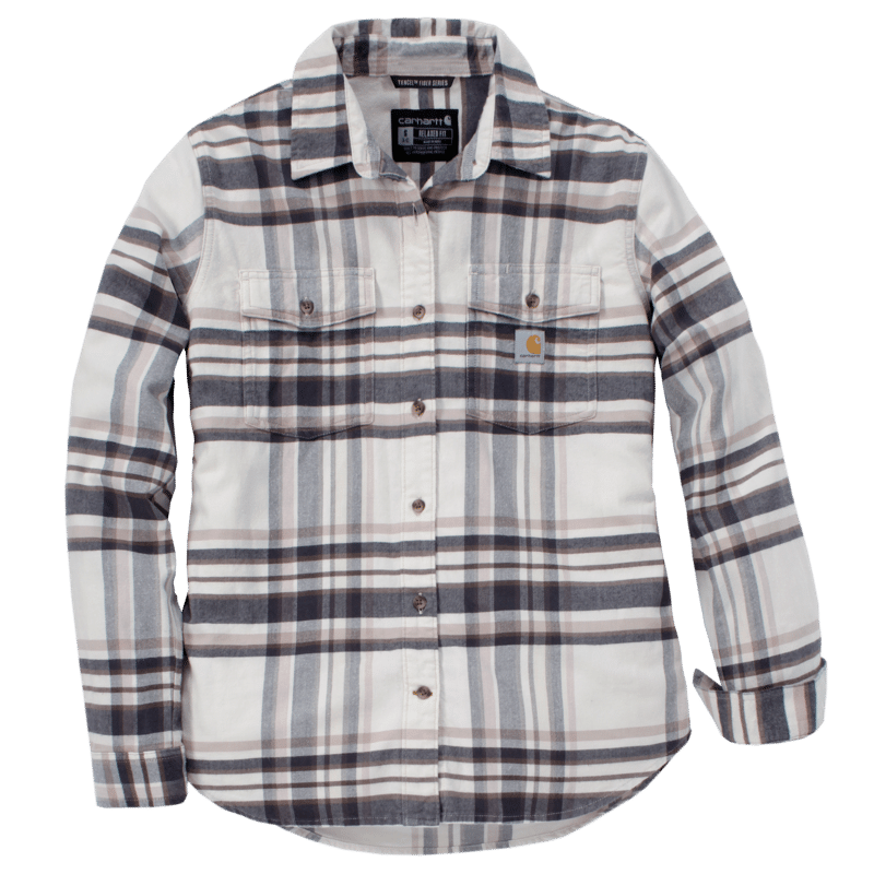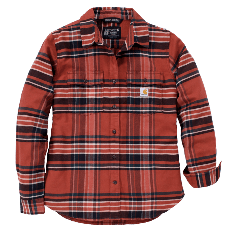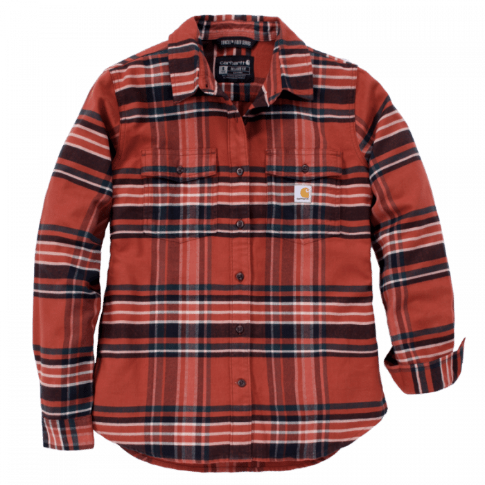 Chemise femme manches longues en coton flanelle • Col évasé • 2 poches poitrine avec rabat et fermeture par bouton • Fermeture frontale à boutons • Poignets réglables deux boutons • Coutures principales triples • Étiquette Carhartt® cousue sur la poche avant gauche.