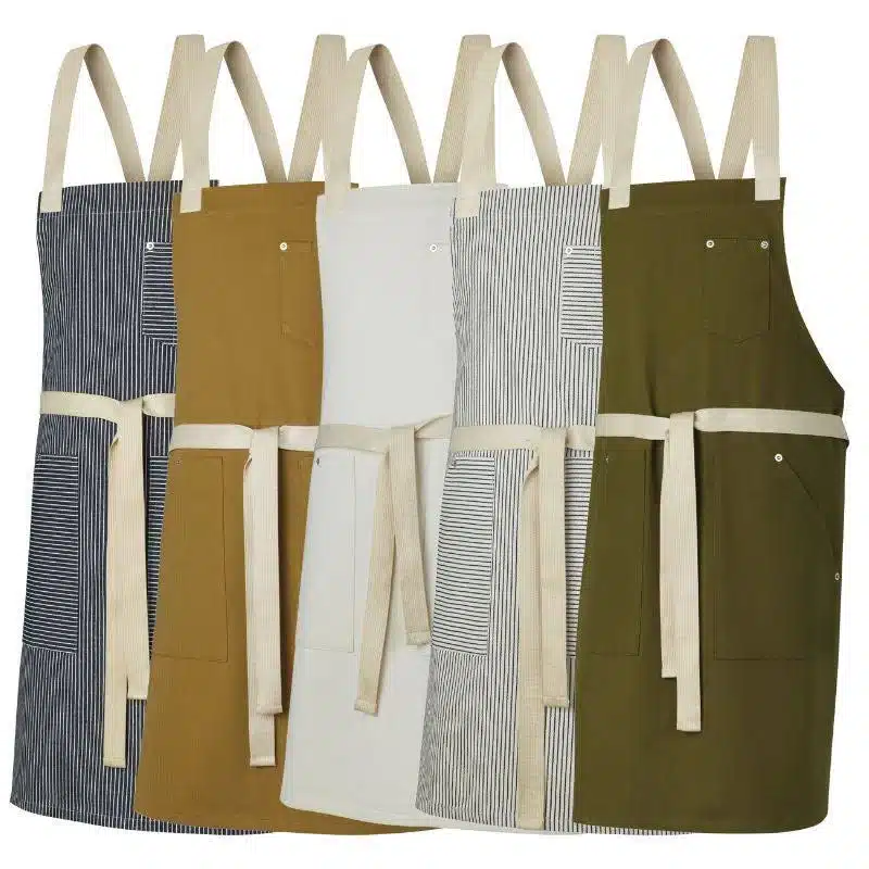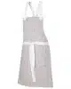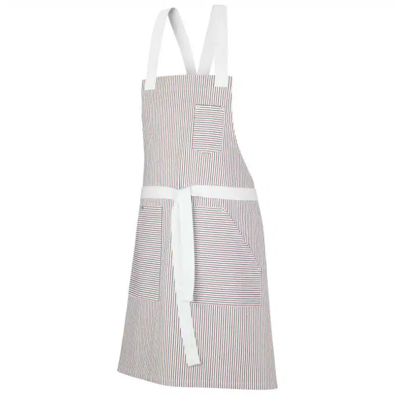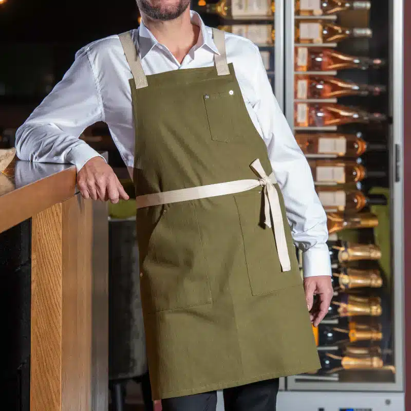 La coupe est généreuse avec une hauteur de 80 cm et une largeur de 82 cm, offrant une excellente couverture. Liens croisés dans le dos en gros grain 100 % polyester, assurant un bon maintien sans stress sur le cou. À l’avant : 1 poche stylo poitrine et 2 grandes poches basses, toutes renforcées par rivets inox, pour accueillir ustensiles ou accessoires sans risque d’usure. Le tablier comprend aussi des œillets inox dans le dos pour passage du lien et ajustement facile. Il se lave en machine à 40 °C.